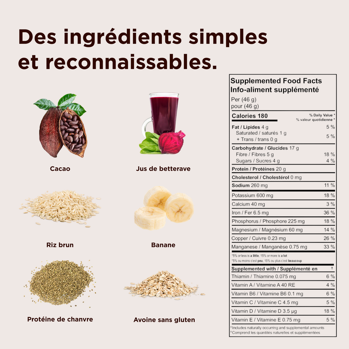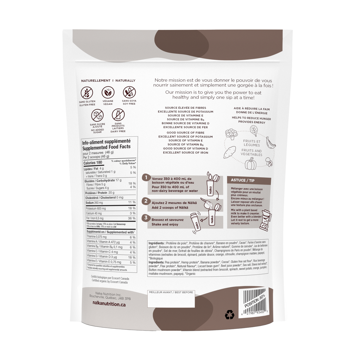 Protéine de pois*, Protéine de chanvre*, Banane en poudre*, Cacao*, Farine d'avoine sans gluten*, Boisson de riz en poudre*, Protéine de lin*, Arôme naturel*, Gomme de caroube*, Jus de betterave en poudre*, Sel de mer, Extrait de feuilles de stévia*, Champignons de Paris en poudre*, Mélange de vitamines (extraites de brocoli, épinard, patate douce, orange, citrouille, champignon maitake, papaye).