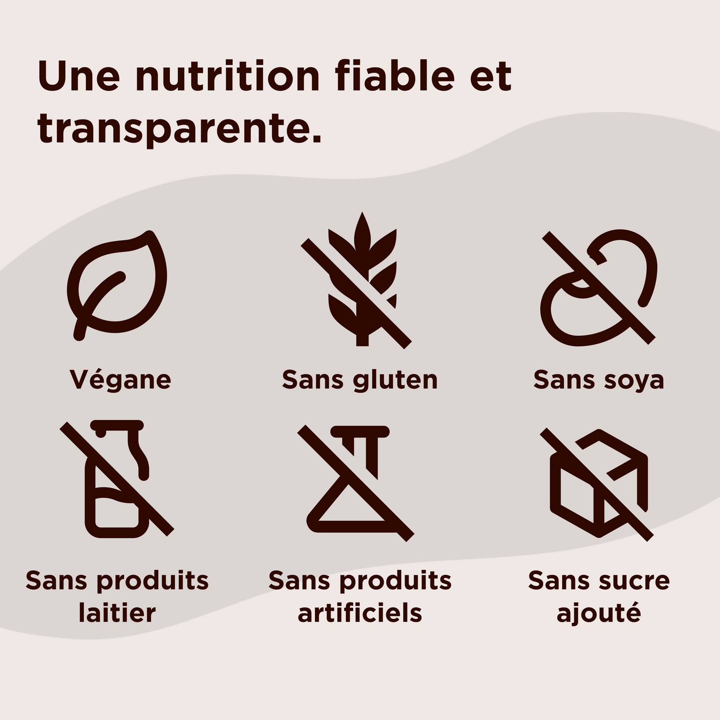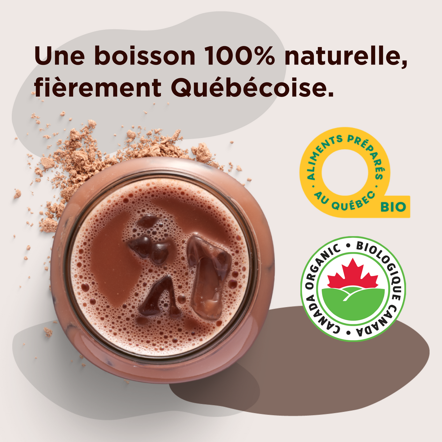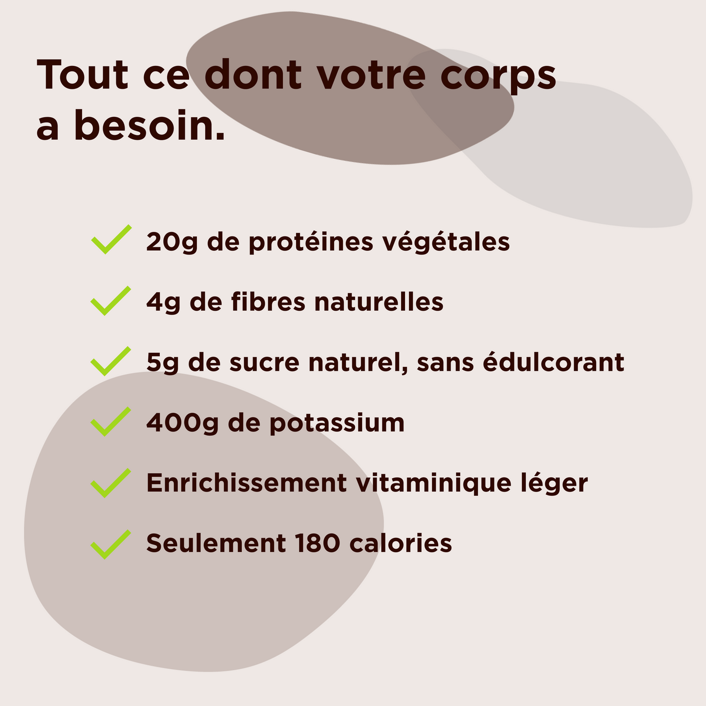 Découvrez notre délicieuse boisson protéinée à base de plantes, une fusion savoureuse de protéines de haute qualité, de fruits et légumes riches en nutriments, le tout sublimé par l'intense saveur naturelle du chocolat. Cette concoction exquise est spécialement élaborée pour combler vos besoins nutritionnels tout en vous régalant de l'intensité et de l'onctuosité du chocolat.