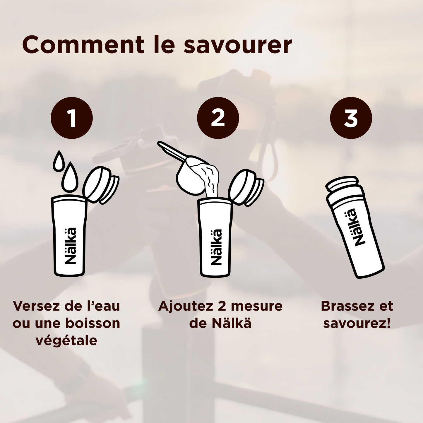 Le moment choisi dépend vraiment de vos objectifs et de votre emploi du temps quotidien. Nälkä est idéal le matin pour un déjeuner pratique, à emporter. Il peut également constituer un dîner rapide si vous devez accomplir votre journée de travail avec un minimum de distractions, ou un souper de fin de soirée pratique qui ne sera pas trop lourd et ne perturbera pas votre sommeil. Si vous souhaitez l'utiliser de manière plus stratégique, pour alimenter vos séances d'entraînement, vous pouvez le consommer comme repas de pré ou post entraînement ou même comme collation.